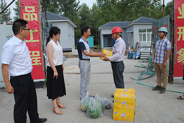 在施工工地,公司党总支书记赵国盈对工人表示了亲切慰问 ,他说,现在工程任务紧而重,要尤其注意高温下的生产安全,要把各项安全防护措施落实到位,不能马虎大意,把安全当成重中之重,确保高温下工程顺利推进。