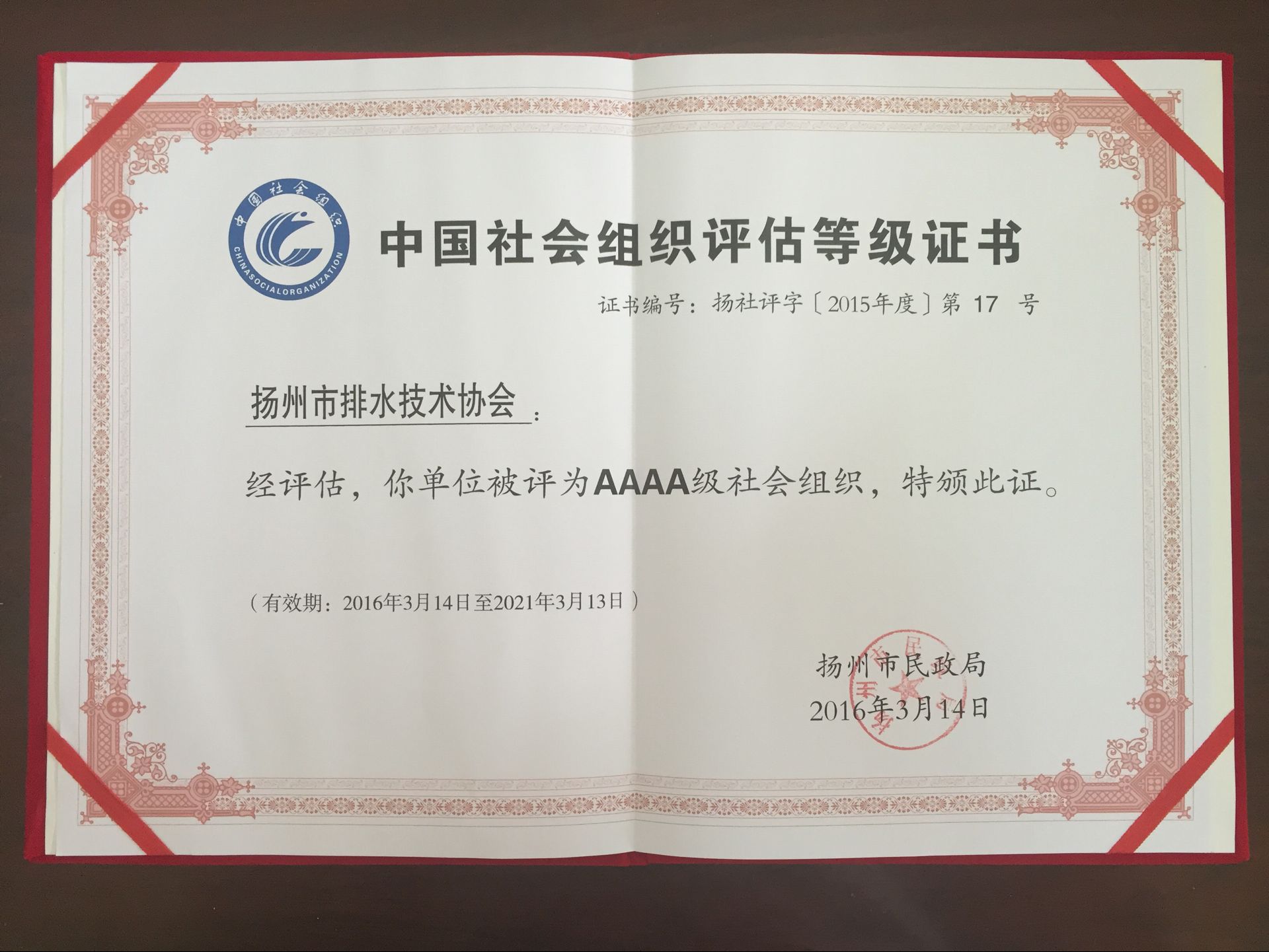 近日,市民政局公布了2015年度社会组织4A等级评估名单,由洁源公司发起成立的扬州市排水技术协会被评为4A级协会。