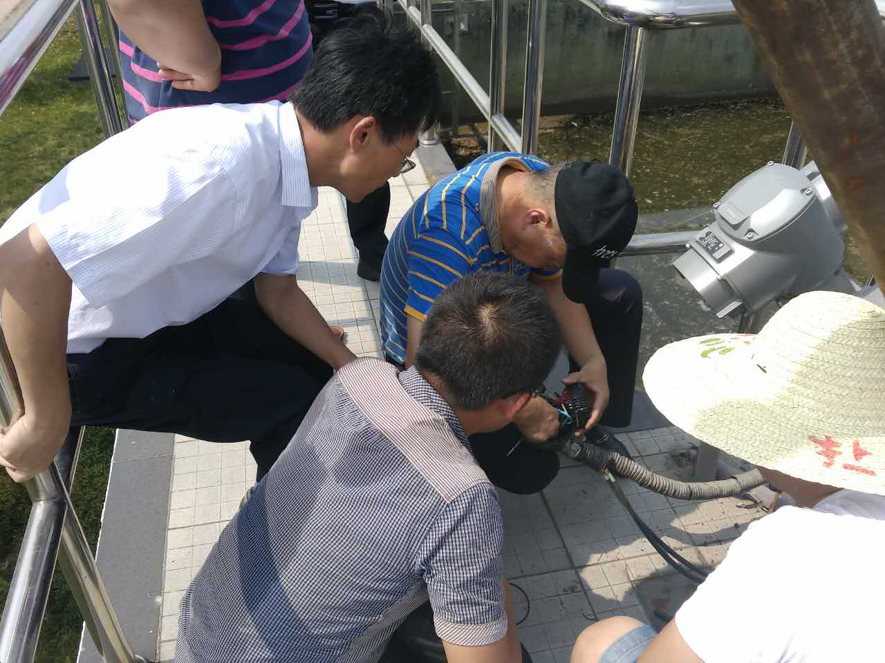 在汤汪污水厂生物池,3名设备检修工正紧张工作着,每道维修工序,每个测试节点,机修班班长蒋宏根都要进行验收与把关。此时正值下午3点,烈日之下,地面温度已将近40度,而检修平台上的温度至少50度。在6米高的设备检修平台上,历经近1个小时的维修,故障的撇水器已经恢复了工作。蒋宏根拿着一块抹布,习惯性地把维修设备上的灰尘和油垢擦干净,汗水不住地往下滴,他掏出口袋里的矿泉水,一饮而尽 “终于解决问题,该去下一个报修点了。”