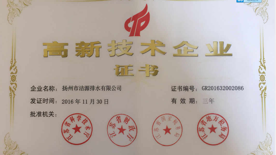 近日,扬州市洁源排水公司成功通过由江苏省科学技术厅、江苏省财政厅、江苏省国家税务局、江苏省地方税务局联合批准的“高新技术企业”认证,并获得相关政策支持。