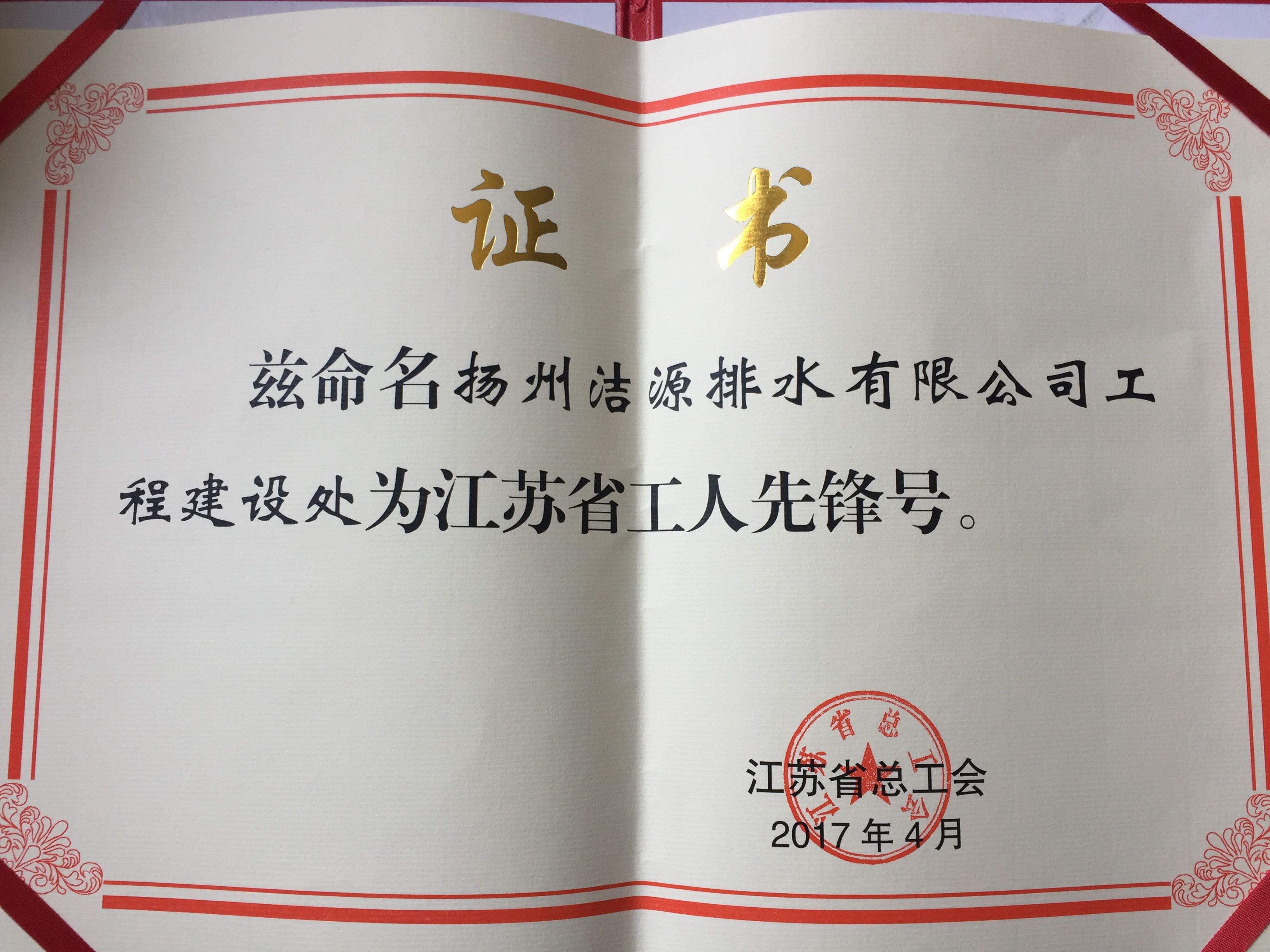2017年4月28日上午从市会议中心传来喜讯,由市委、市政府组织召开的扬州市劳动模范和先进工作者表彰大会中,洁源公司工程建设处被省总工会授予“省工人先锋号”的光荣称号。