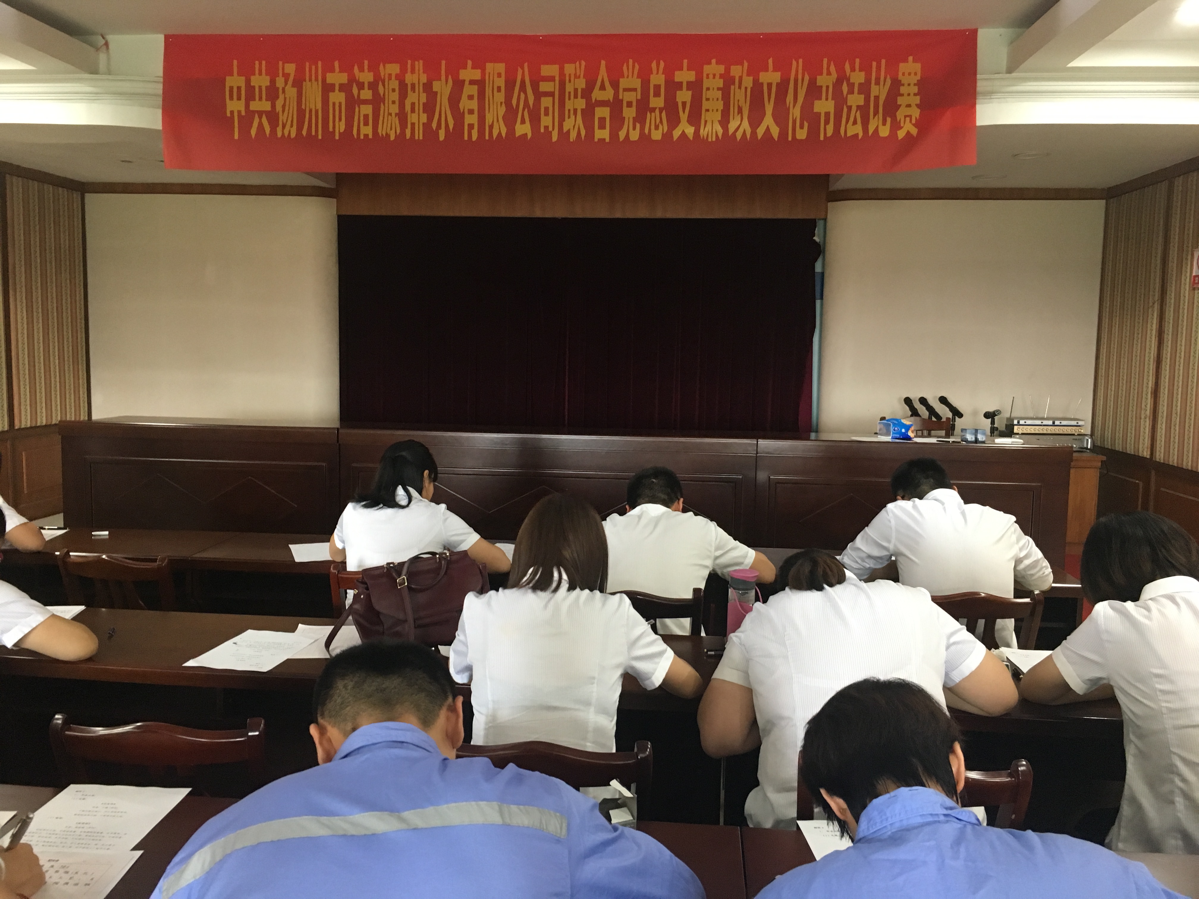 为进一步宣传廉洁文化,提升职工廉洁意识,根据“廉政文化进企业”活动的安排,7月14日,由洁源公司联合党总支举办的“迎七.一”廉政系列活动之廉政书法比赛成功举办。洁源排水公司、中法环境公司、洁源光伏发电公司30余名职工共同参赛。