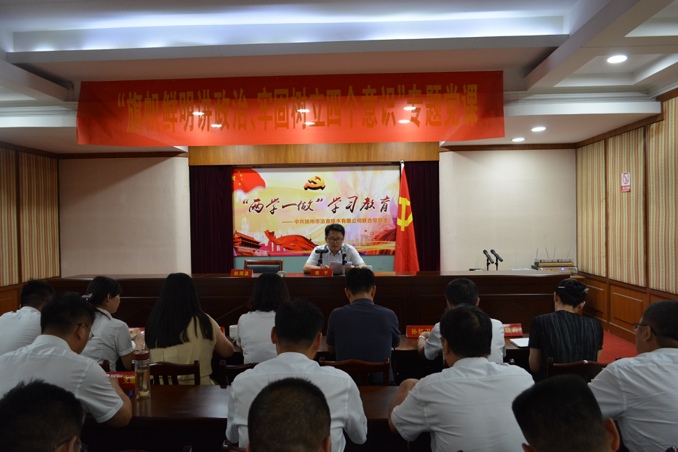 为贯彻落实“两学一做”学习教育活动要求,根据集团党委统一安排,7月19日下午城控集团公司副总经理周平同志为公司联合党总支全体党员干部讲授了《旗帜鲜明讲政治、牢固树立四个意识》专题党课。洁源公司、中法环境、洁源光伏全体领导班子成员,以及全体党员干部参加了学习。会议由公司联合党总支书记赵国盈同志主持。