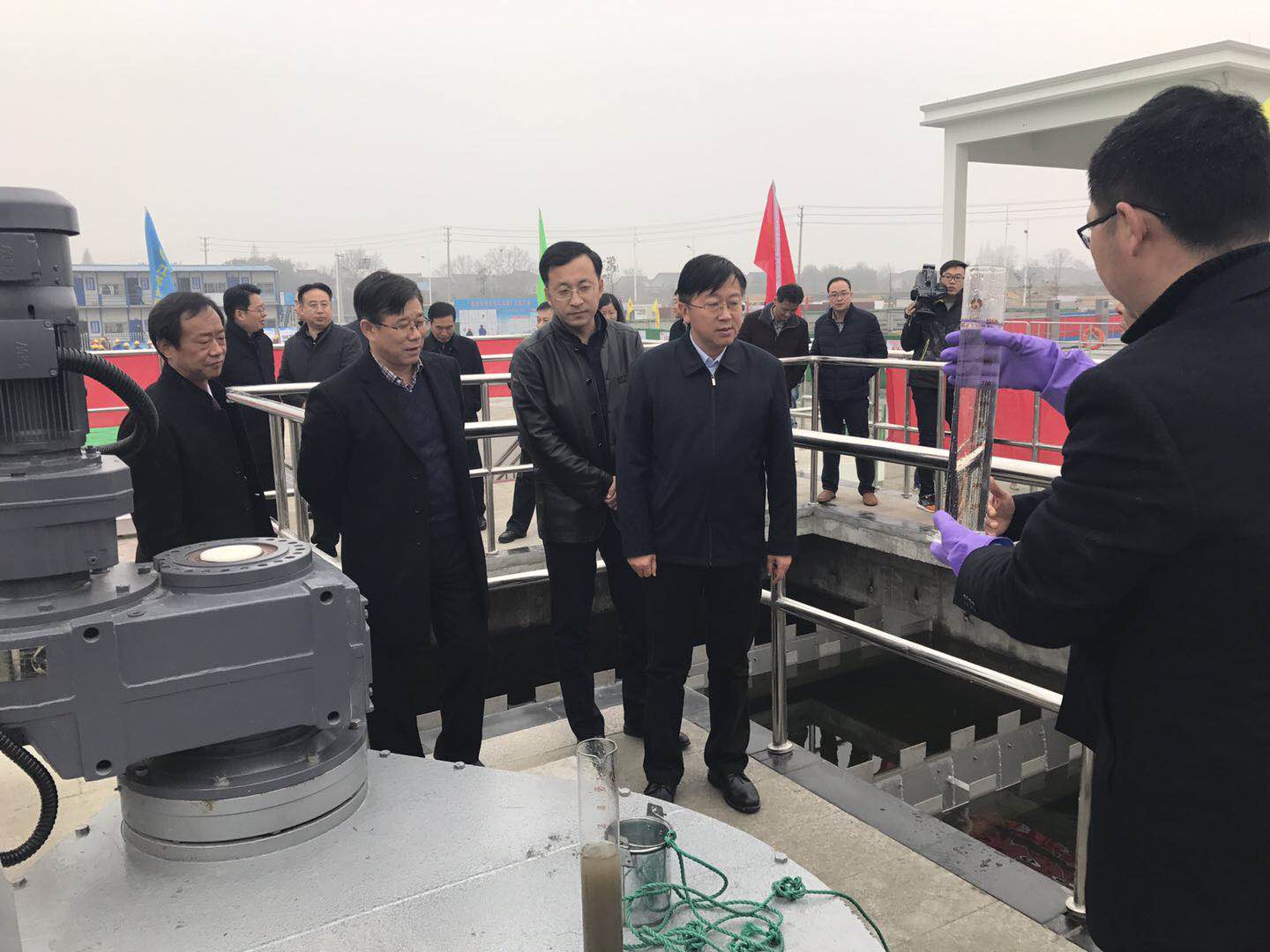 孙建年同志宣布汤汪污水处理厂三期工程一二期提标改造项目正式通水,与市建设局和市国资委领导共同启动通水水晶球,并来到一二期提标项目厂区参观通水运行情况。