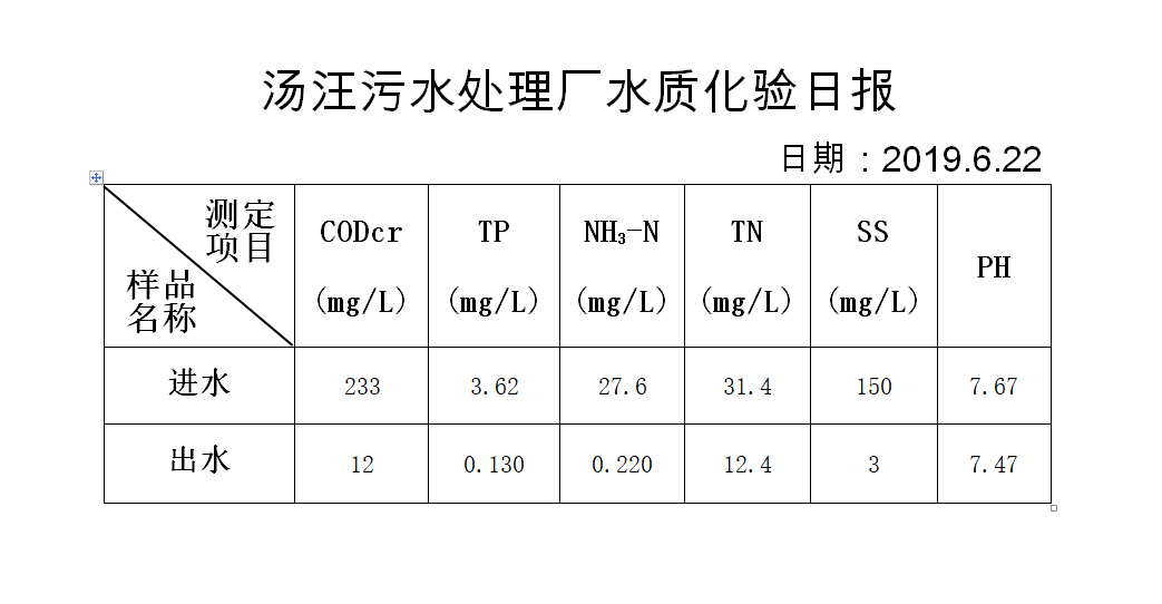 汤汪污水处理厂水质化验日报(2019.6.22)