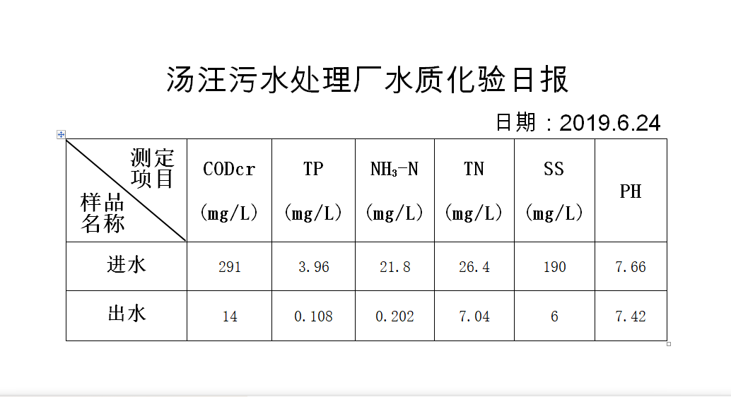 汤汪污水处理厂水质化验日报(2019.6.24)