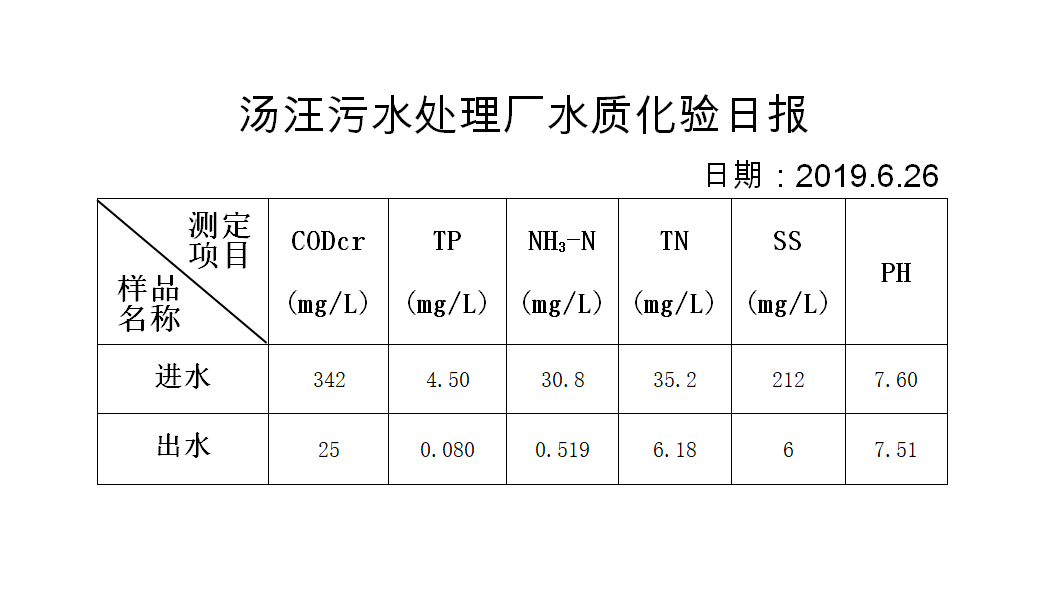 汤汪污水处理厂水质化验日报(2019.6.26)