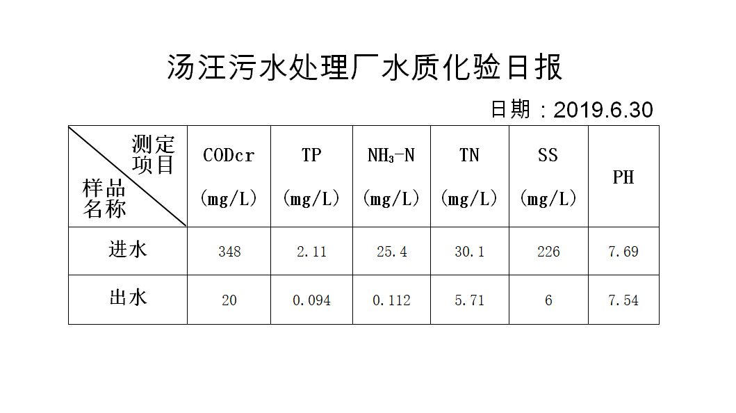 汤汪污水处理厂水质化验日报(2019.6.30)