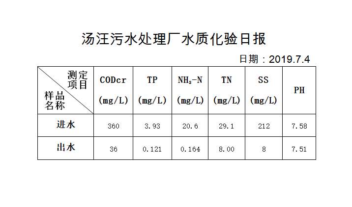 汤汪污水处理厂水质化验日报(2019.7.4)