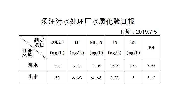 汤汪污水处理厂水质化验日报(2019.7.5)
