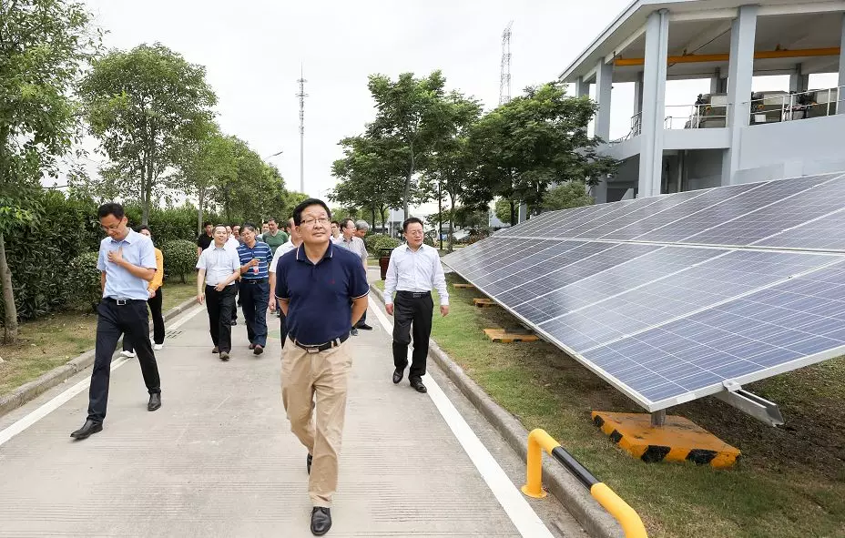 7月10日下午,江苏省发改委资环培训观摩团在省发改委副主任、省能源局党组书记、局长季鸣的率领下,来到洁源排水公司六圩污水处理厂,实地调研和观摩“污水处理—光伏发电—污泥干化—再生水利用”绿色循环经济产业链的建设和运营情况。集团副总经理周平,市发改委相关部门负责人,洁源排水公司党总支书记、总经理刘义忠,洁源光伏公司总经理姚江,以及相关处室负责人陪同调研。