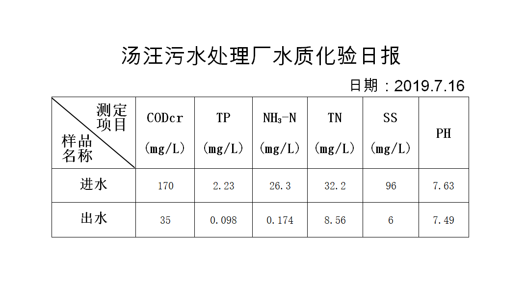 汤汪污水处理厂水质化验日报(2019.7.16)