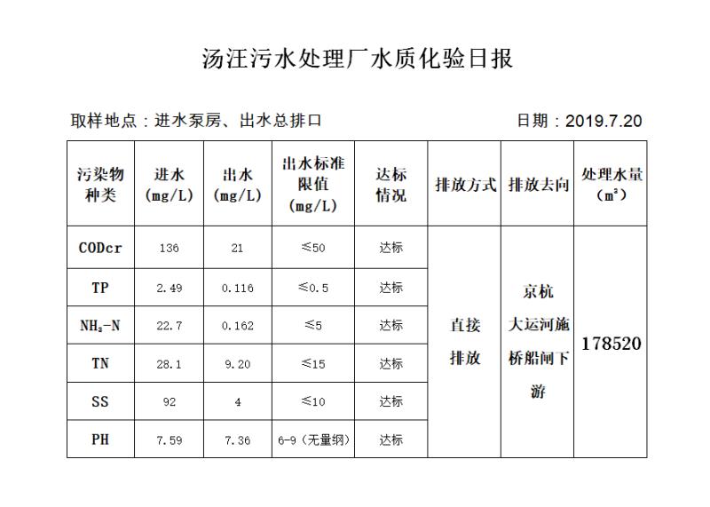汤汪污水处理厂水质化验日报(2019.7.20)