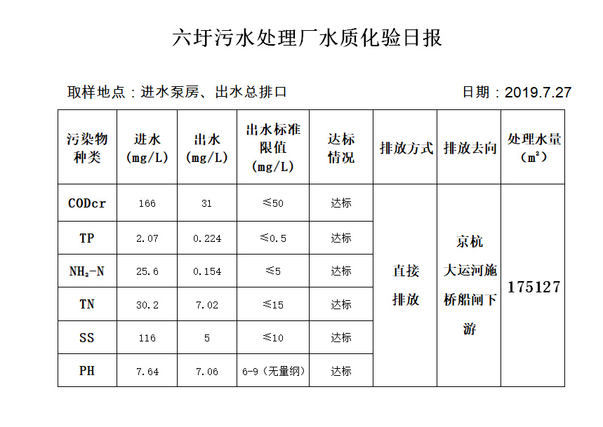 六圩污水处理厂水质化验日报(2019.7.27)