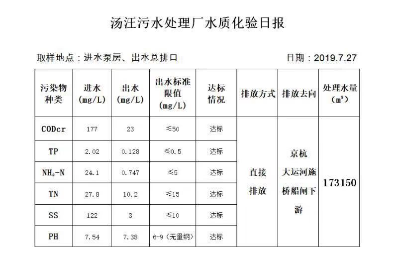 汤汪污水处理厂水质化验日报(2019.7.27)