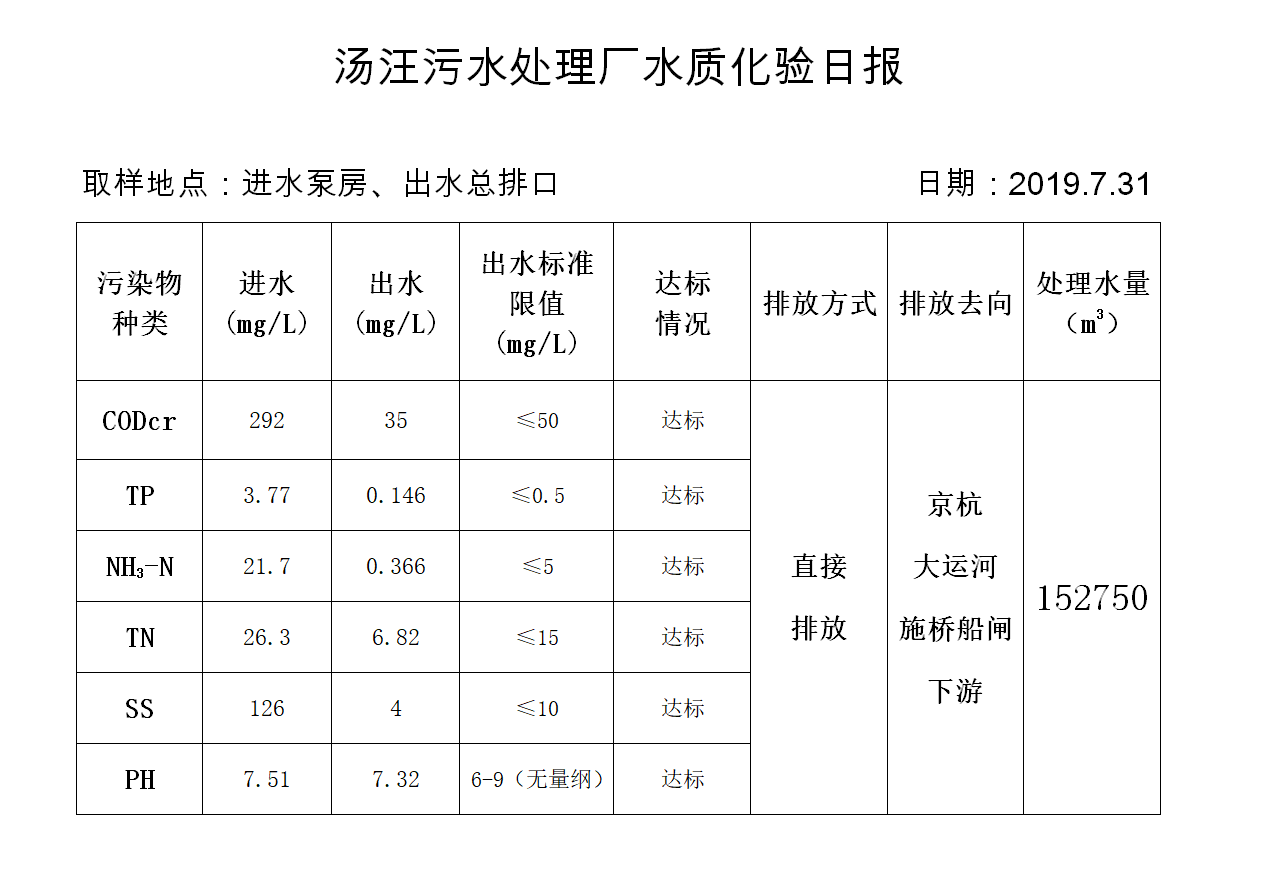 汤汪污水处理厂水质化验日报(2019.7.31)