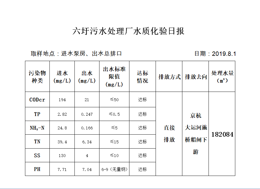 六圩污水处理厂水质化验日报(2019.8.1)