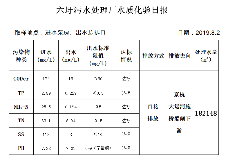 六圩污水处理厂水质化验日报(2019.8.2)