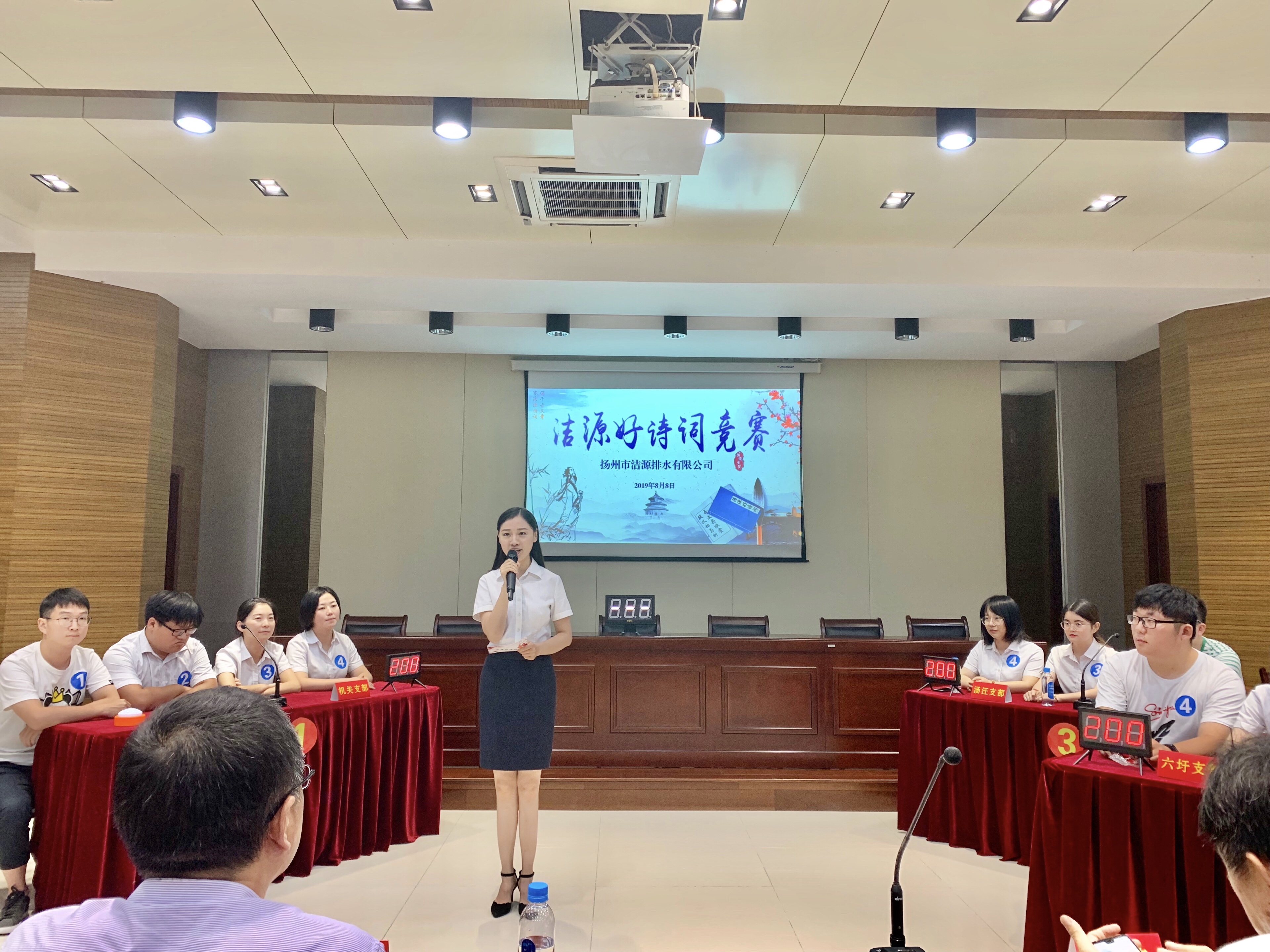 “天生我材必有用,千金散尽还复来”。8月8日下午,在六圩污水处理厂大会议室,“洁源好诗词”竞赛活动如期举行。公司党总支书记、总经理刘义忠,安全总监徐扬与50余名职工共同观看了这场诗词盛会,并为选手们加油鼓劲。