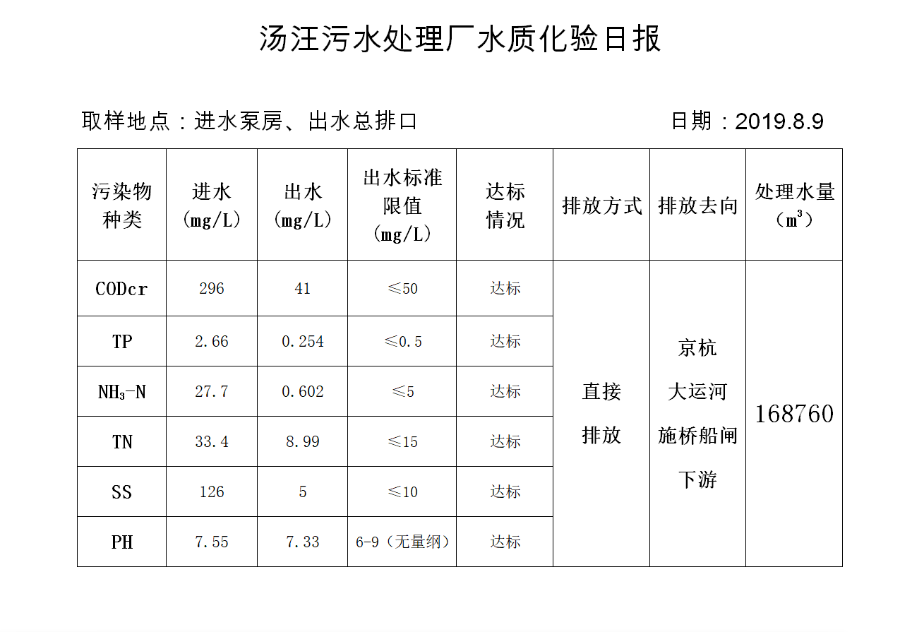 汤汪污水处理厂水质化验日报(2019.8.9)