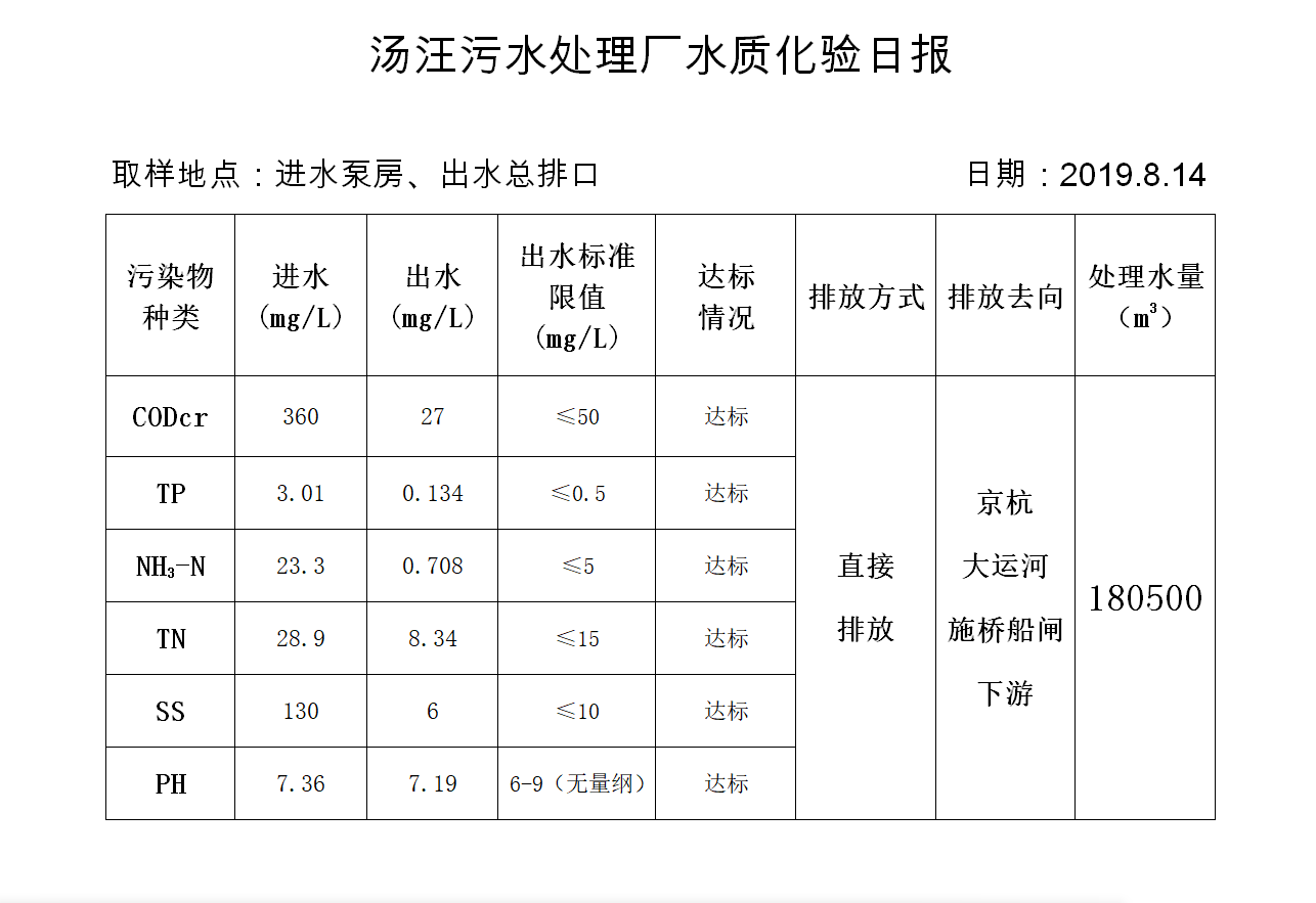 汤汪污水处理厂水质化验日报(2019.8.14)