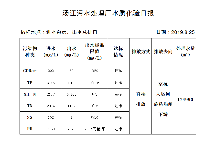 汤汪污水处理厂水质化验日报(2019.8.25)