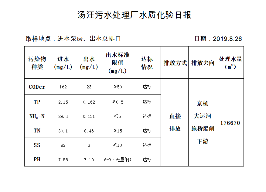 汤汪污水处理厂水质化验日报(2019.8.26)