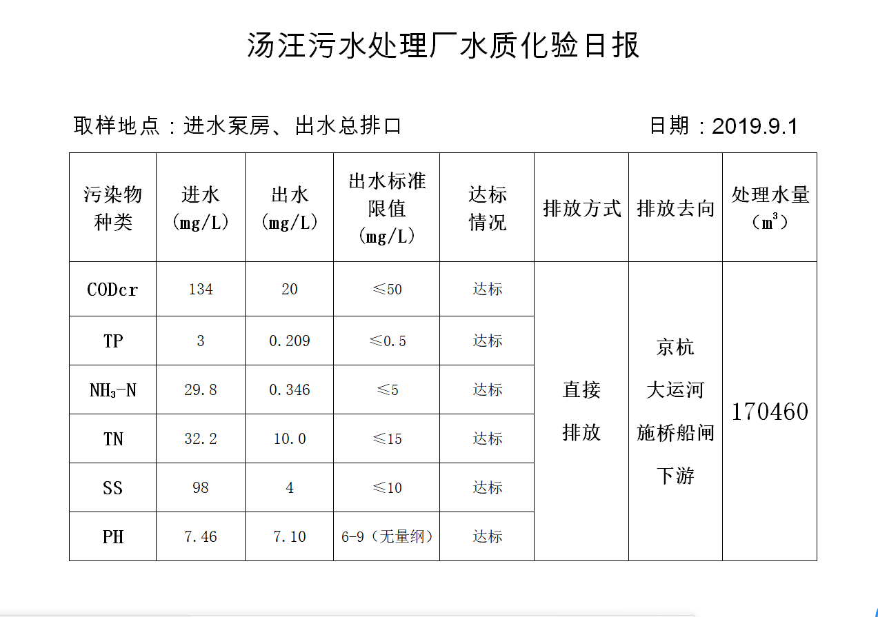汤汪污水处理厂水质化验日报(2019.9.1)