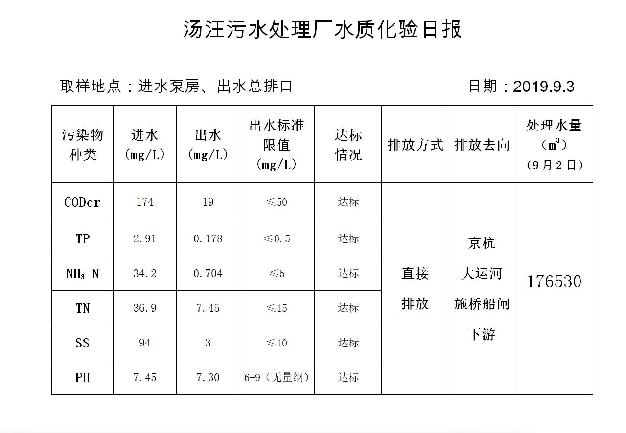 汤汪污水处理厂水质化验日报(2019.9.3)