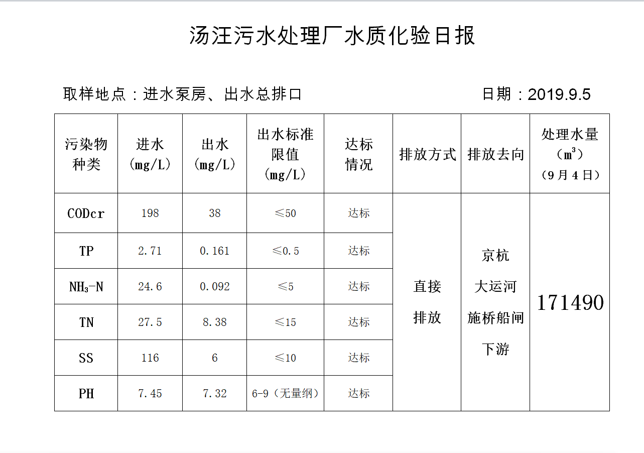 汤汪污水处理厂水质化验日报(2019.9.5)