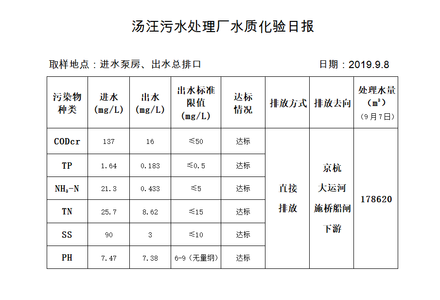 汤汪污水处理厂水质化验日报(2019.9.8)