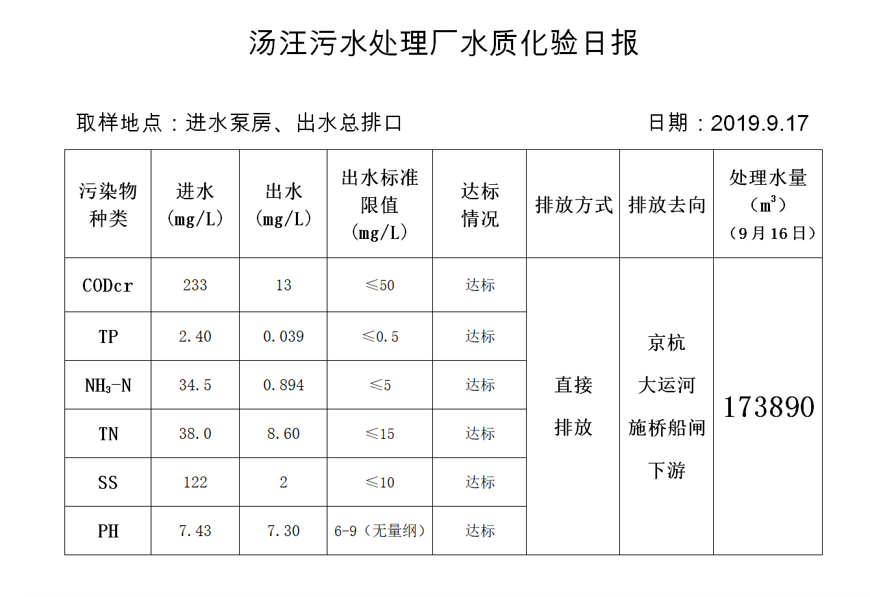 汤汪污水处理厂水质化验日报(2019.9.17)