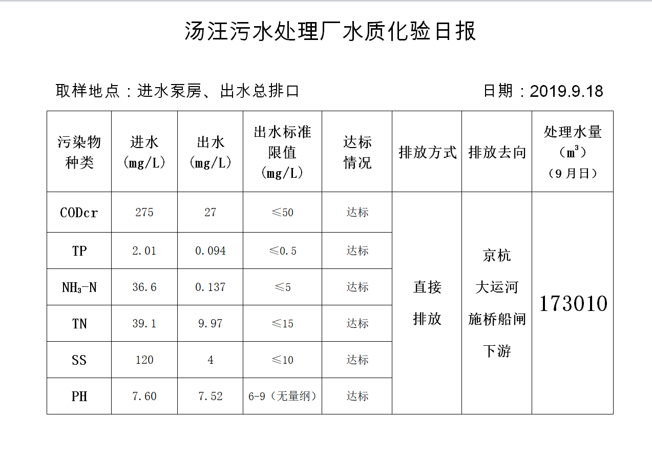 汤汪污水处理厂水质化验日报(2019.9.18)