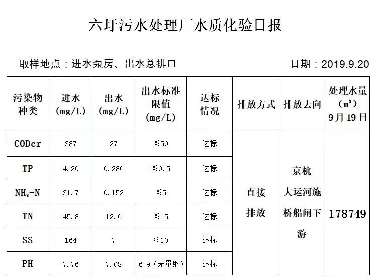 六圩污水处理厂水质化验日报(2019.9.20)
