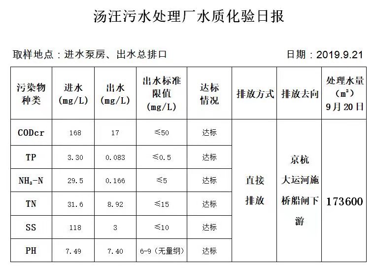 汤汪污水处理厂水质化验日报(2019.9.21)