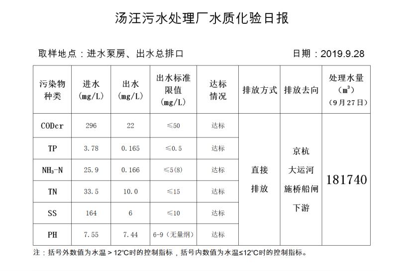 汤汪污水处理厂水质化验日报(2019.9.28)