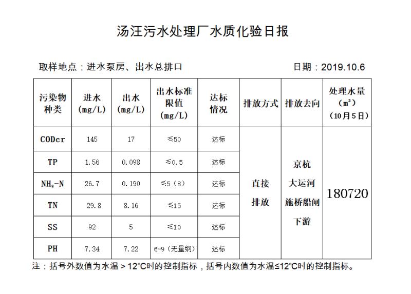 汤汪污水处理厂水质化验日报(2019.10.6)