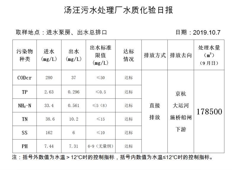 汤汪污水处理厂水质化验日报(2019.10.7)