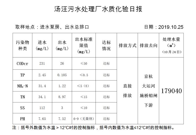 汤汪污水处理厂水质化验日报(2019.10.25)