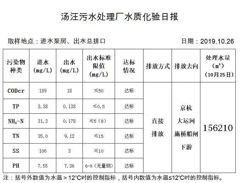 汤汪污水处理厂水质化验日报(2019.10.26)