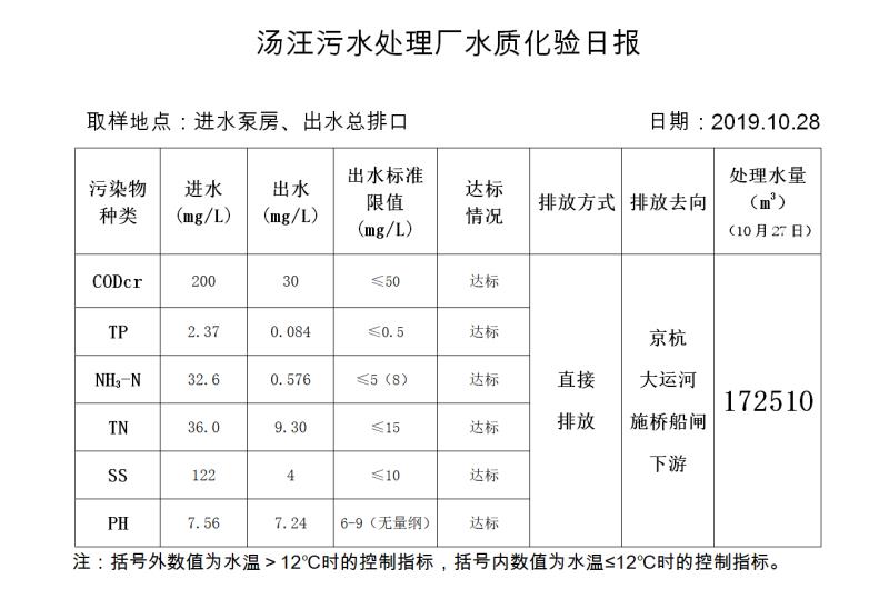 汤汪污水处理厂水质化验日报(2019.10.28)