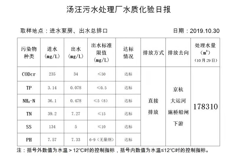 汤汪污水处理厂水质化验日报(2019.10.30)