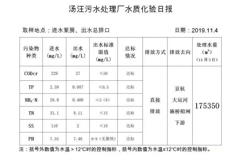 汤汪污水处理厂水质化验日报(2019.11.4)