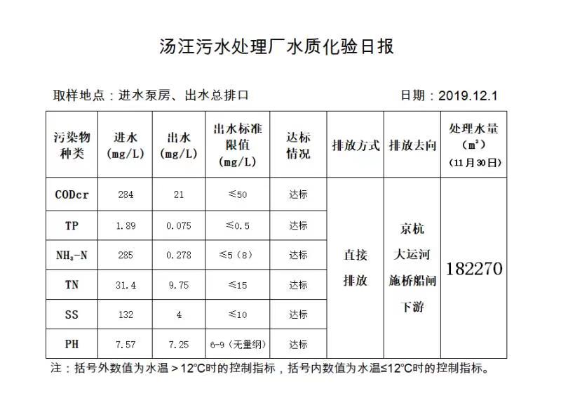 汤汪污水处理厂水质化验日报(2019.12.1)