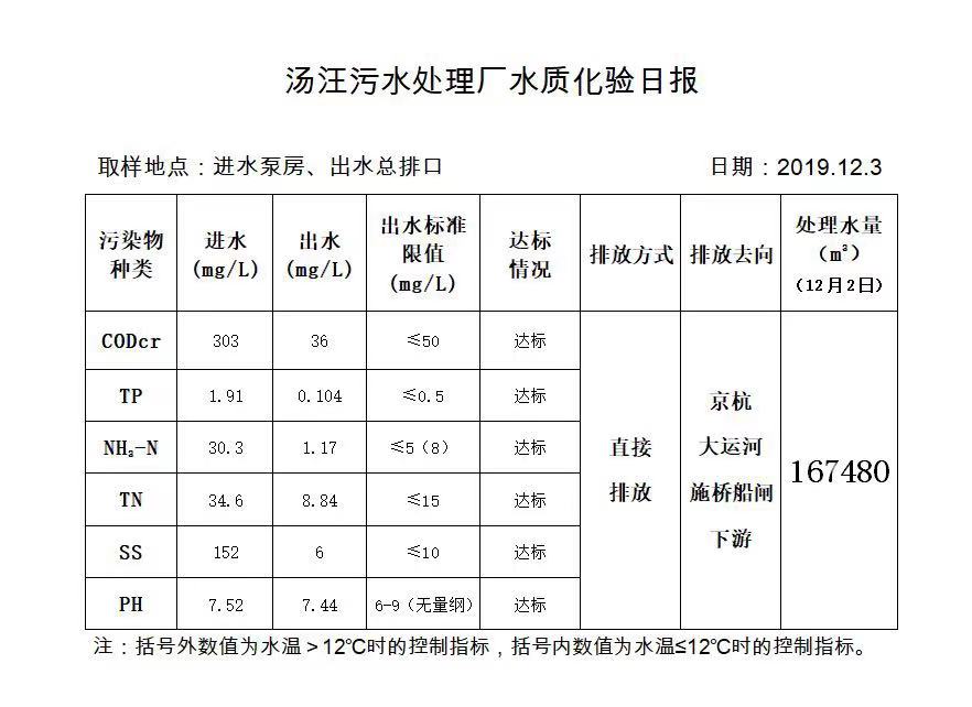 汤汪污水处理厂水质化验日报(2019.12.3)
