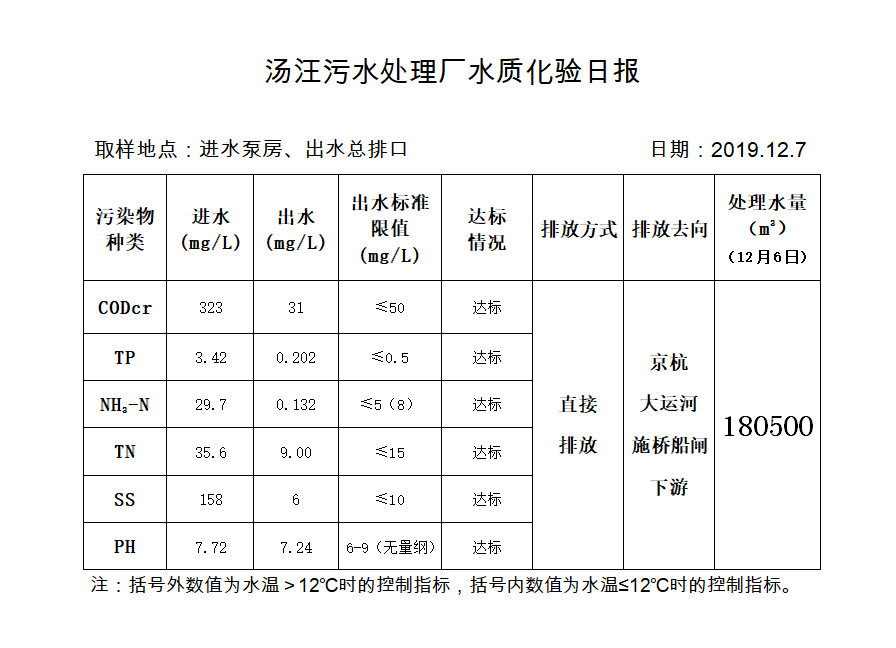 汤汪污水处理厂水质化验日报(2019.12.7)