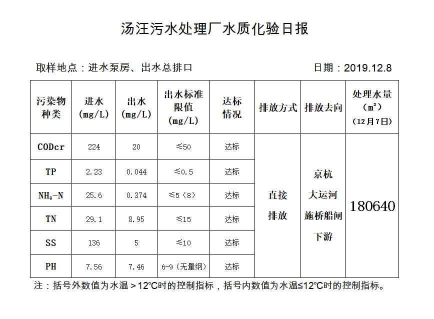 汤汪污水处理厂水质化验日报(2019.12.8)
