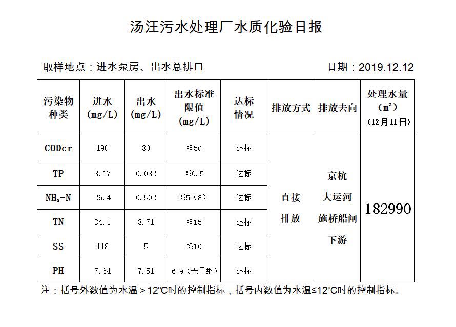 汤汪污水处理厂水质化验日报(2019.12.12)