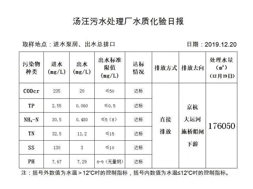 汤汪污水处理厂水质化验日报(2019.12.20)