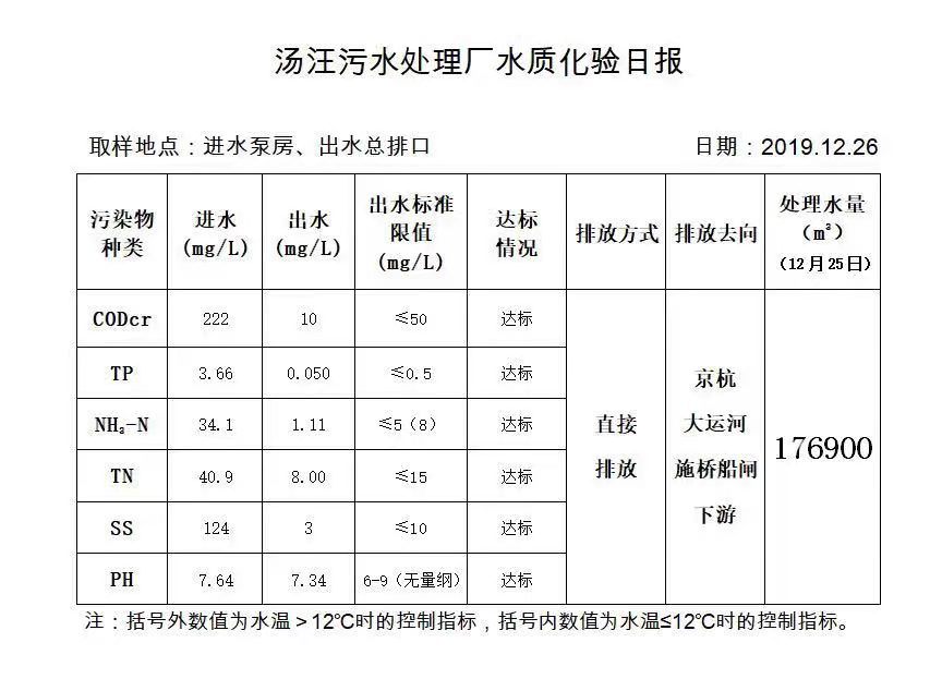 汤汪污水处理厂水质化验日报(2019.12.26)